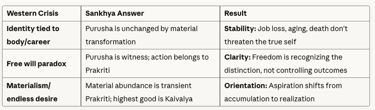 Patanjali's Ashtanga Yoga: A structured system to bring the mind (chitta) under control, allowing Purusha to rest in its own nature. This directly combats the psychological fragmentation and existential anxiety that characterize modern Western life.